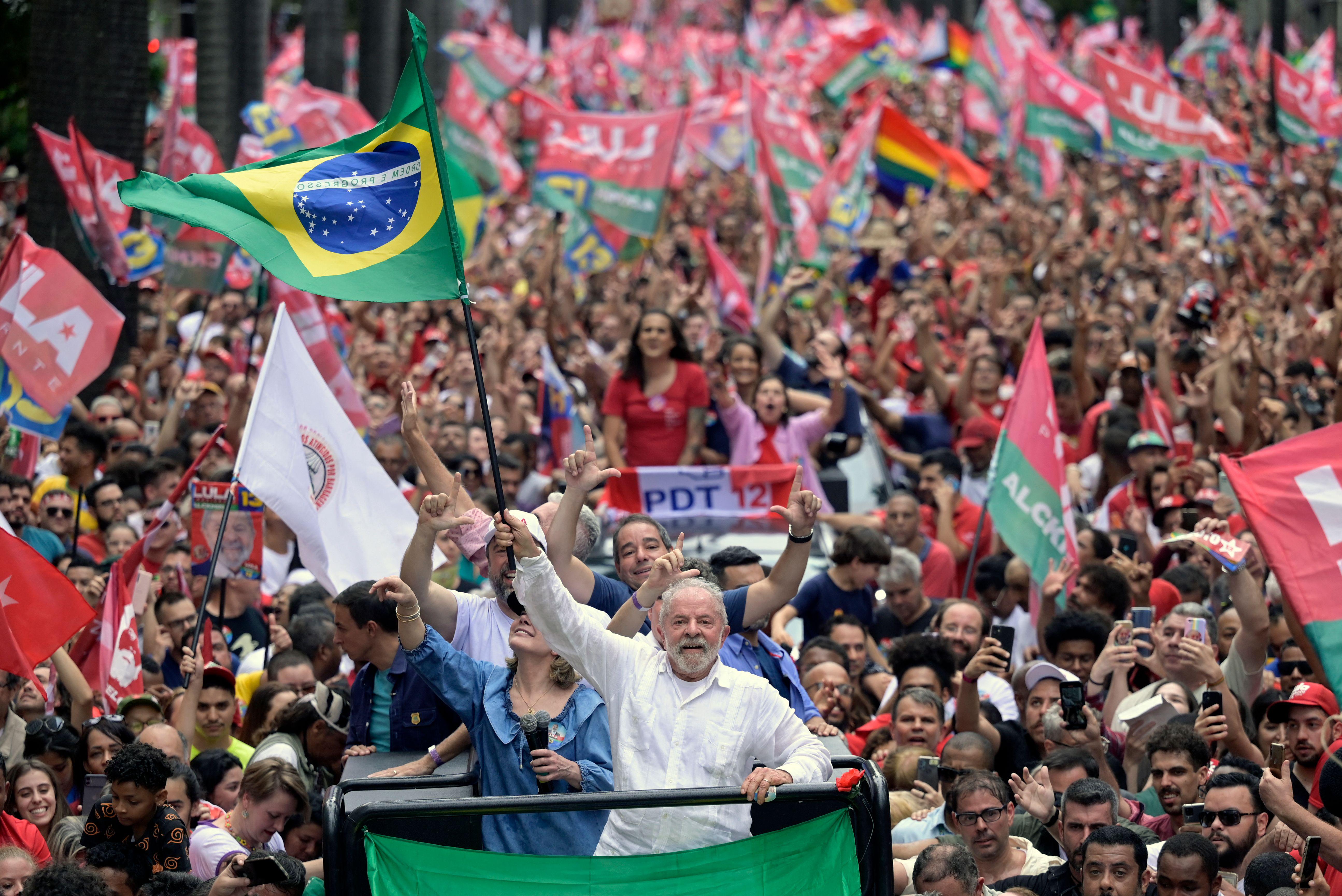 Brazilian President Lula da Silva (then a presidential candidate) waves to a crowd at a campaign rally on October 9, 2022
