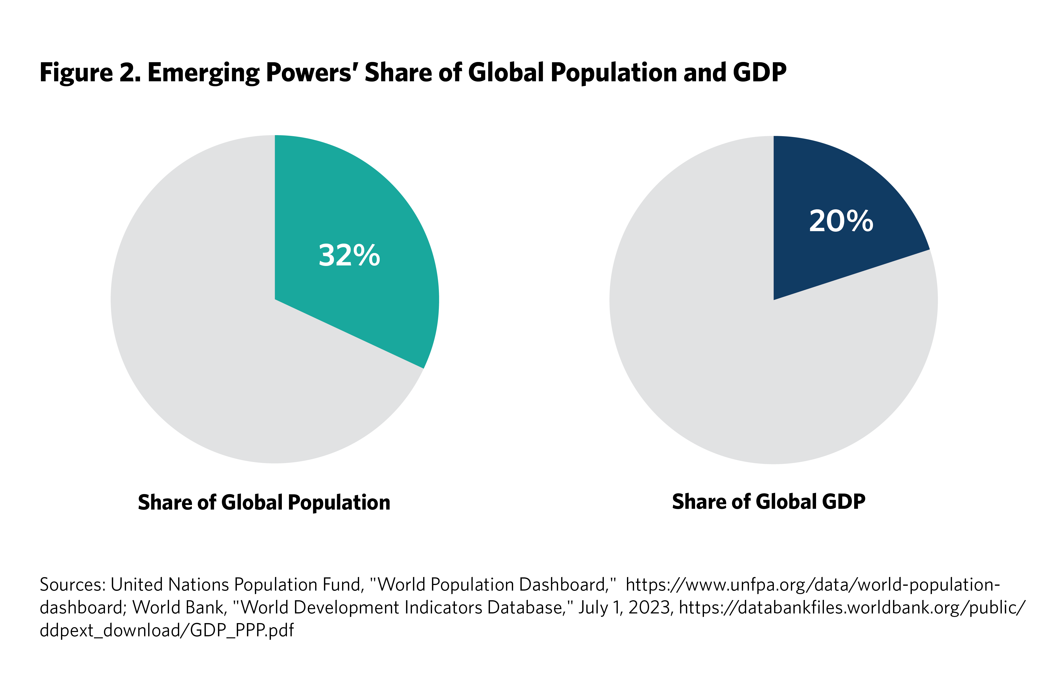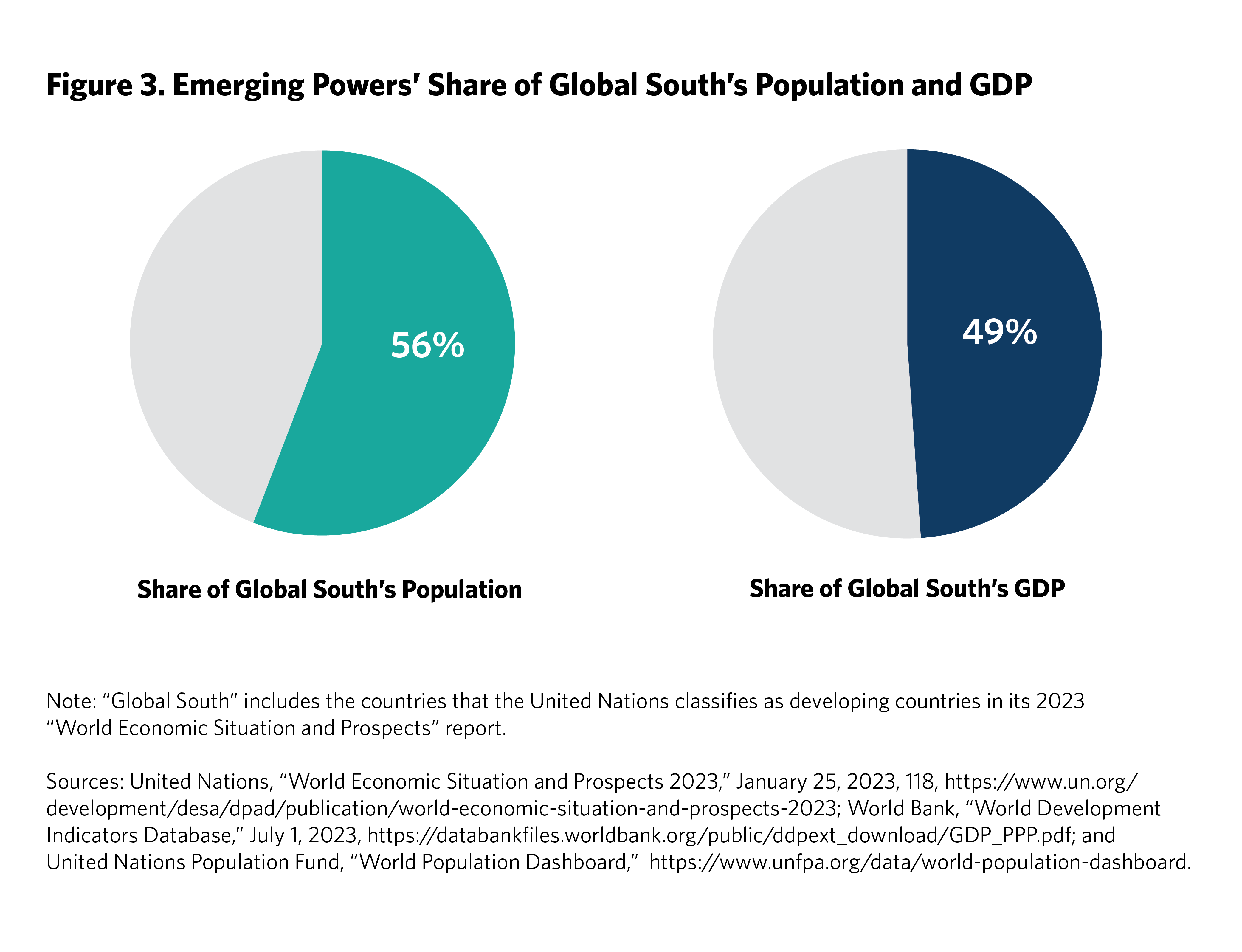 Each of these countries has a large economy, with most weighing in above half a trillion dollars and larger than those of, say, Poland, Sweden, or Taiwan. India has by far the largest population among them, but Brazil, Indonesia, Mexico, Nigeria, and Türkiye each has a population larger than that of Germany. They make up more than half of the Global South’s gross domestic product (GDP) and nearly half of its population (see figures 2 and 3).
