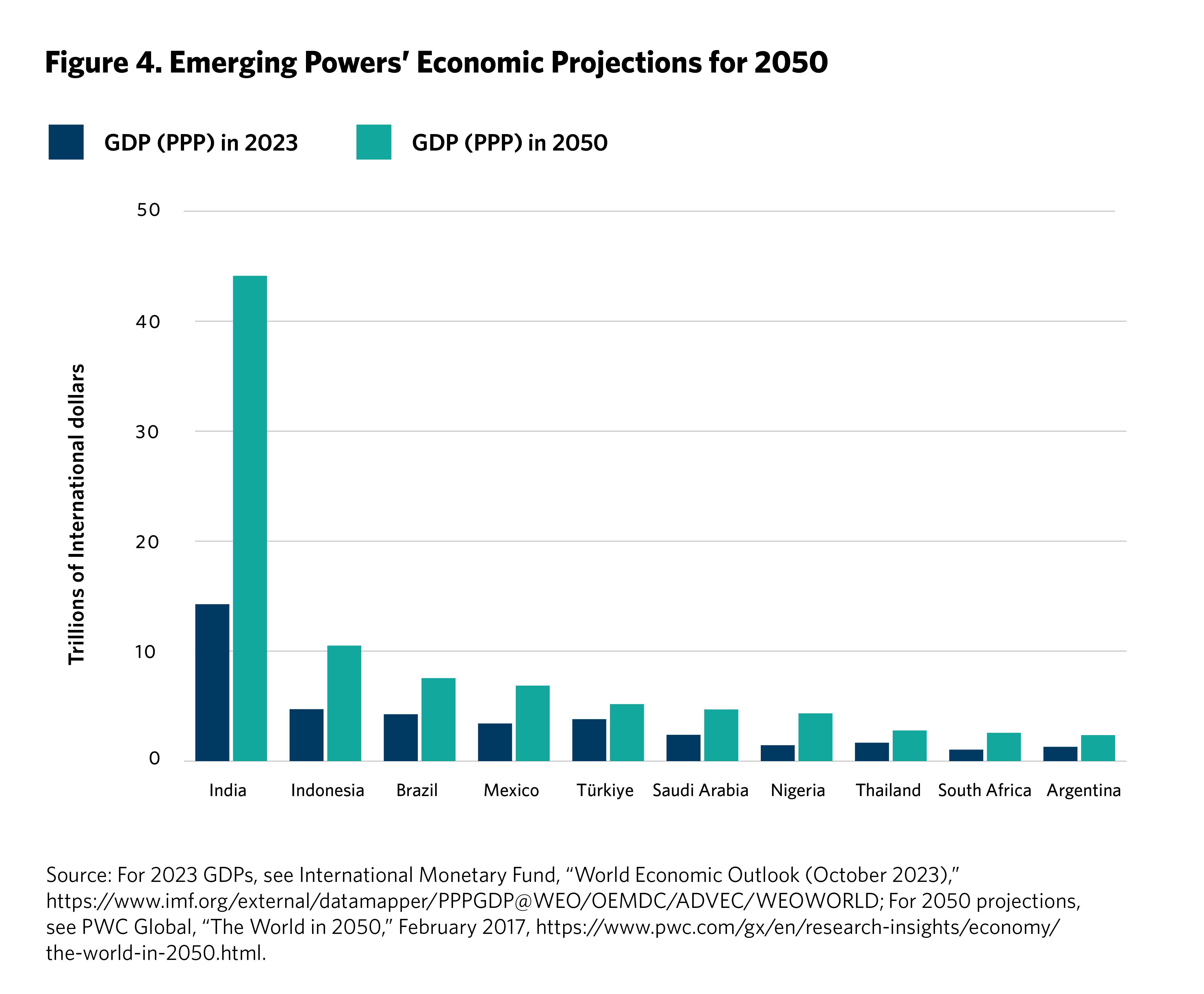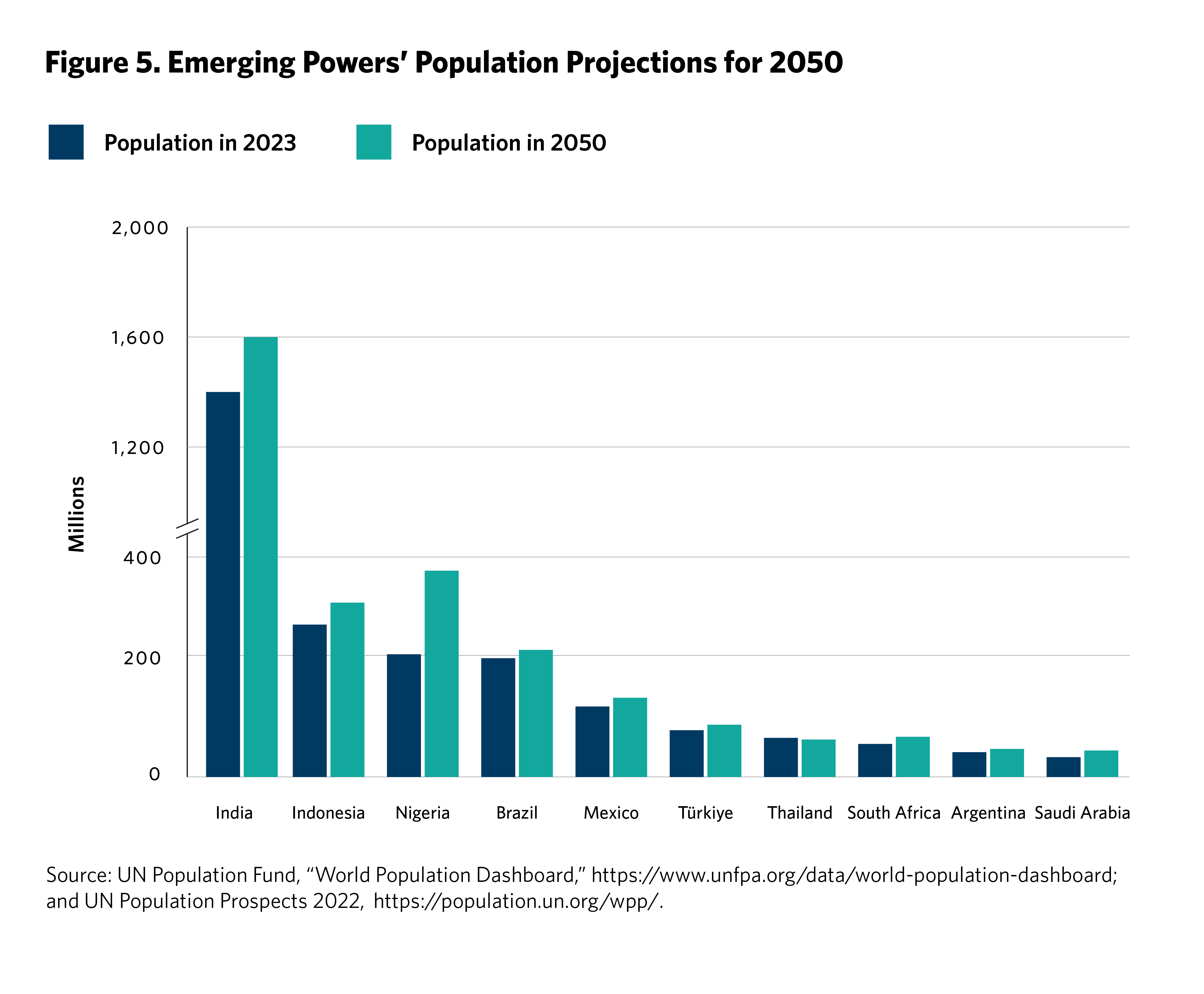 Moreover, these emerging powers are almost certain to have an even greater weight on the global stage in the next two decades.3 They have fast-growing markets and are quickly climbing the ranks of the largest economies. Some economists predict that by 2050, Brazil, India, Indonesia, and Mexico will be among the seven largest economies in the world.4 Some of the ten emerging powers are projected to undergo two- or threefold growth between now and 2050 (see figure 4), as well as significant population increases (see figure 5).