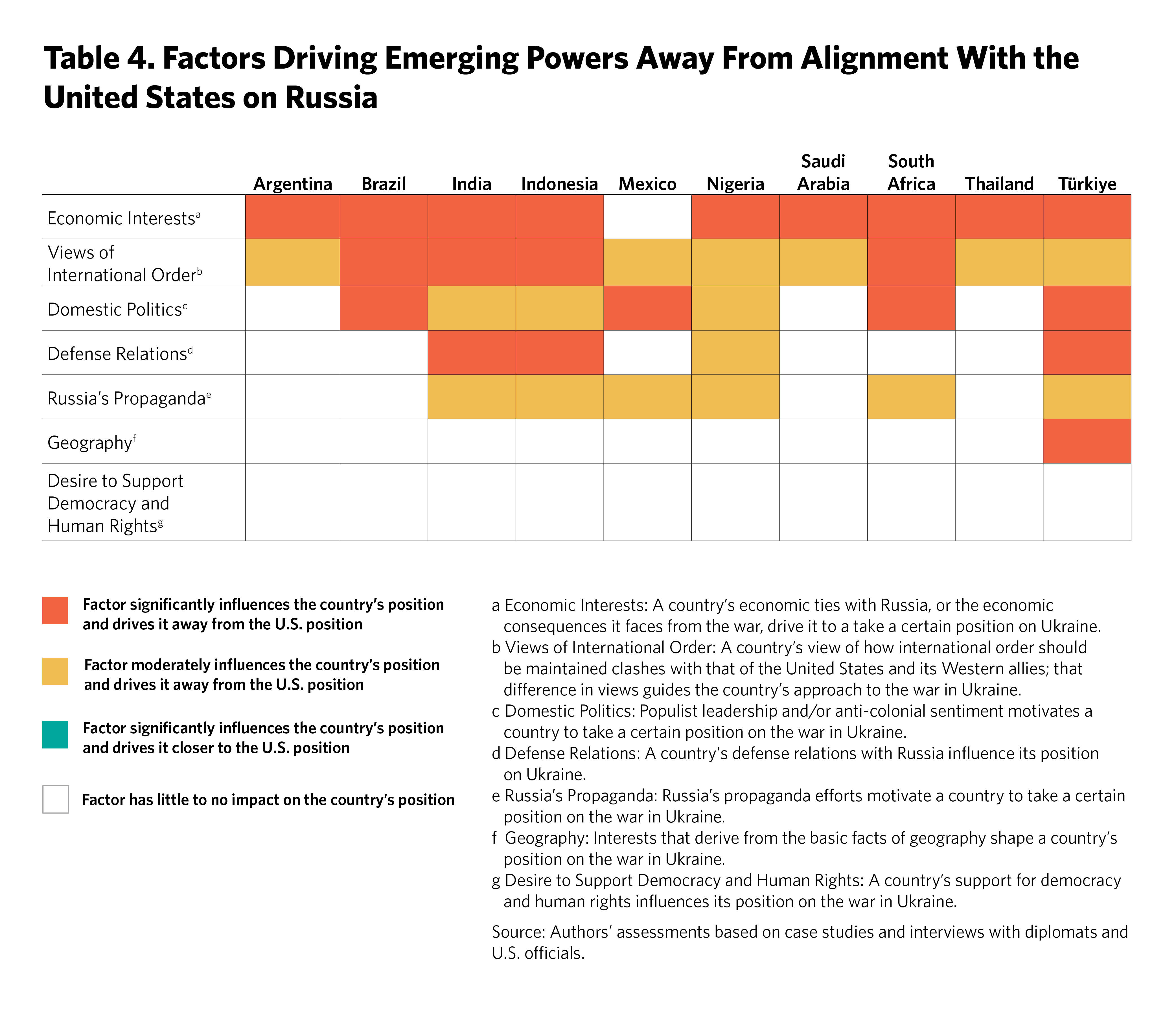 Much existing thinking about the ten emerging powers’ various alignments with China and Russia emphasizes the influence of economic interests. Economic interests do play an important role in shaping their desire to have positive relations with China and, in many cases, with Russia, but they are not the only factor that matters. The emerging powers’ views of what constitutes a just international order, their geographies, their defense relationships, and, in some cases, their domestic politics also play a role. Chinese and Russian propaganda and disinformation also have some influence on them, although this should not be exaggerated. One factor that does not appear to drive the emerging powers is a concern about the state of democracy and human rights in other countries. Tables 4 and 5 summarize the analysis that follows.